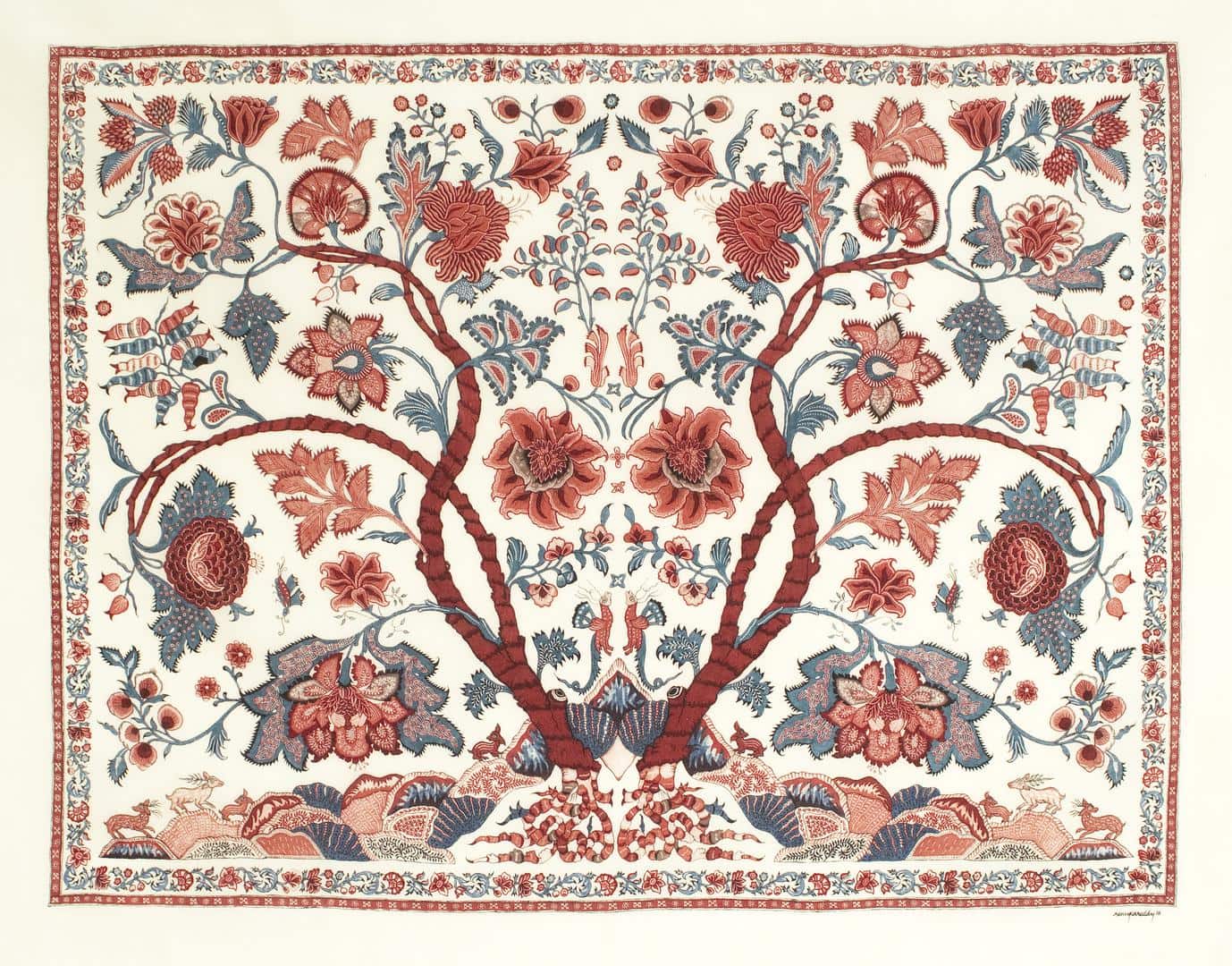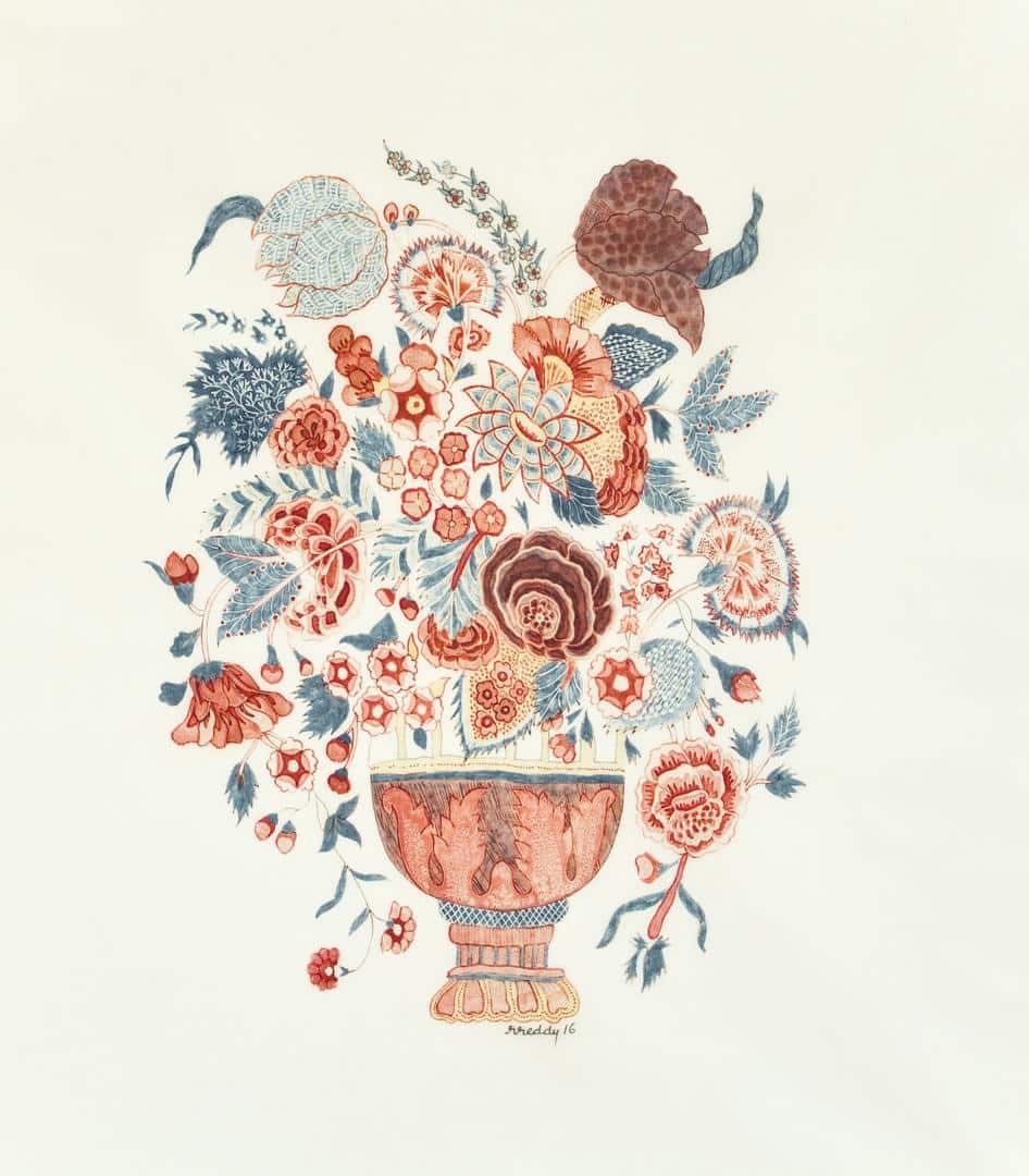 Over the years, I had seen plenty of so-called 'tree of life' patterns based on 18th-century Indian export chintzes. Many had been expertly drawn, but all were less expertly dyed. What set Renuka's pieces apart was not only her fine drawing and her brilliant use of traditional mordants and dyes but, even more significantly, her revival of the technique of fine white resist. This may seem like a minor technical detail, but these sinuous, hand-drawn lines of wax-resist had enabled the early chintz-makers to produce the spiralling and scrolling patterns in white against a coloured ground that made their chintzes so unique. No other contemporary kalamkari artist has mastered this art, and most have not even attempted it, preferring to imitate these beautiful designs by simply drawing them directly onto the cloth, usually in black. Renuka's were the first attempts I had seen to revive this painstaking and laborious resist technique.